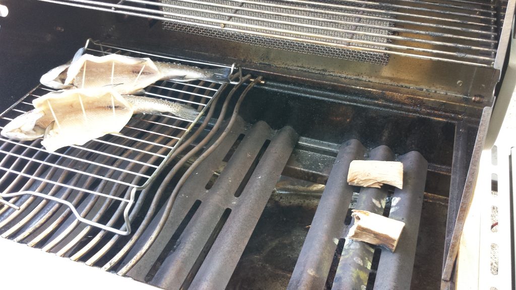 Jetzt habe ich meinen Gasgrill auf 100°C eingeregelt und die eine Seite, wo der Brenner an ist den Rost entfernt, damit ich das Buchenholz zum heiß räuchern auflegen kann. Das Buchenholz habe 2h in Wasser eingelegt. Damit die Forellen auch innen geräuchert sind, habe ich mit Zahnstochern den Bauch aufgeklappt.