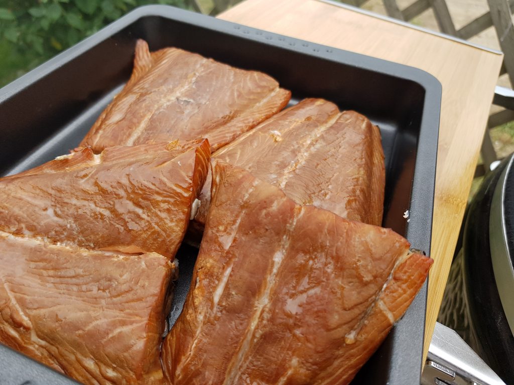 Das Räuchern habe ich mit Lachs versucht. Kinderleicht, denn es gibt eine Klappe, durch die man die Räucherschiene mit der Späne schiebt und dann die Späne direkt auf der Glut verteilen kann.