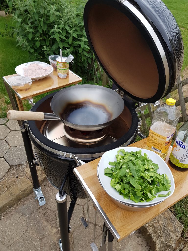 Beim ersten Einbrennen habe ich auch eines meiner Zubehörteile eingebrannt – den Wok mit Wokhalter.